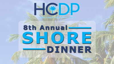 The eighth annual SHORE Dinner, one of HCDP’s major fundraising events of the year, will be held Saturday, September 28, 6-10 p.m., at the Bay Watch Resort and Conference Center, overlooking the ocean, in North Myrtle Beach. The theme is Take a Stand for Democracy.